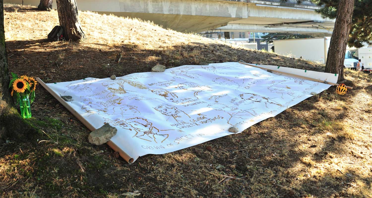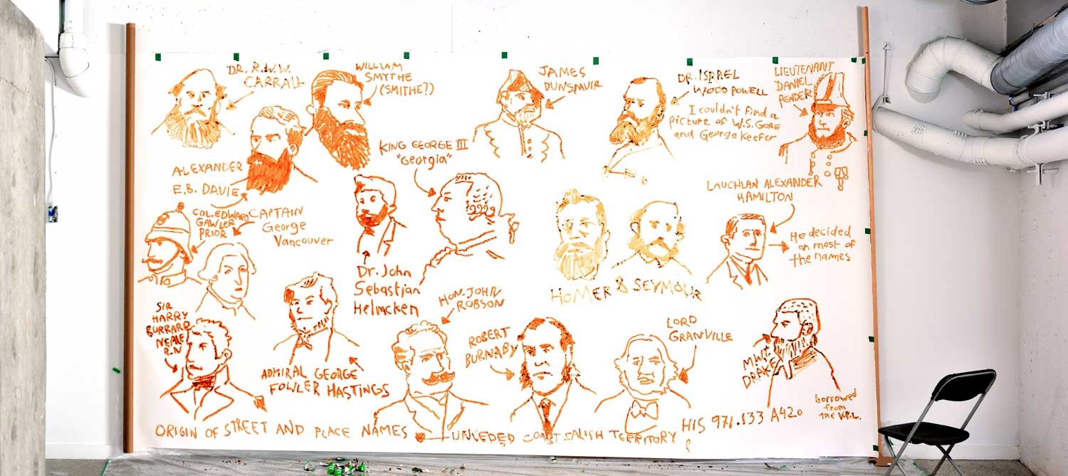 This project is meant to connect the faces with the names that were given to the streets of Vancouver. The large piece of paper rested for a hot day over a patch of grass next to the Georgia Viaduct, in the corner of Union and Main Street. The Georgia Viaduct was built in the 1970's as an incentive to modernize the city and create a freeway that would connect downtown Vancouver to the suburbs. This never happened. The proposed project wanted to destroy most of the south side of Strathcona and indeed managed to wipe out the old neighbourhood popularly known as Hogan's Alley. Hogan's Alley consisted in large part of minority and immigrant groups; it gave home to Vancouver's black community.