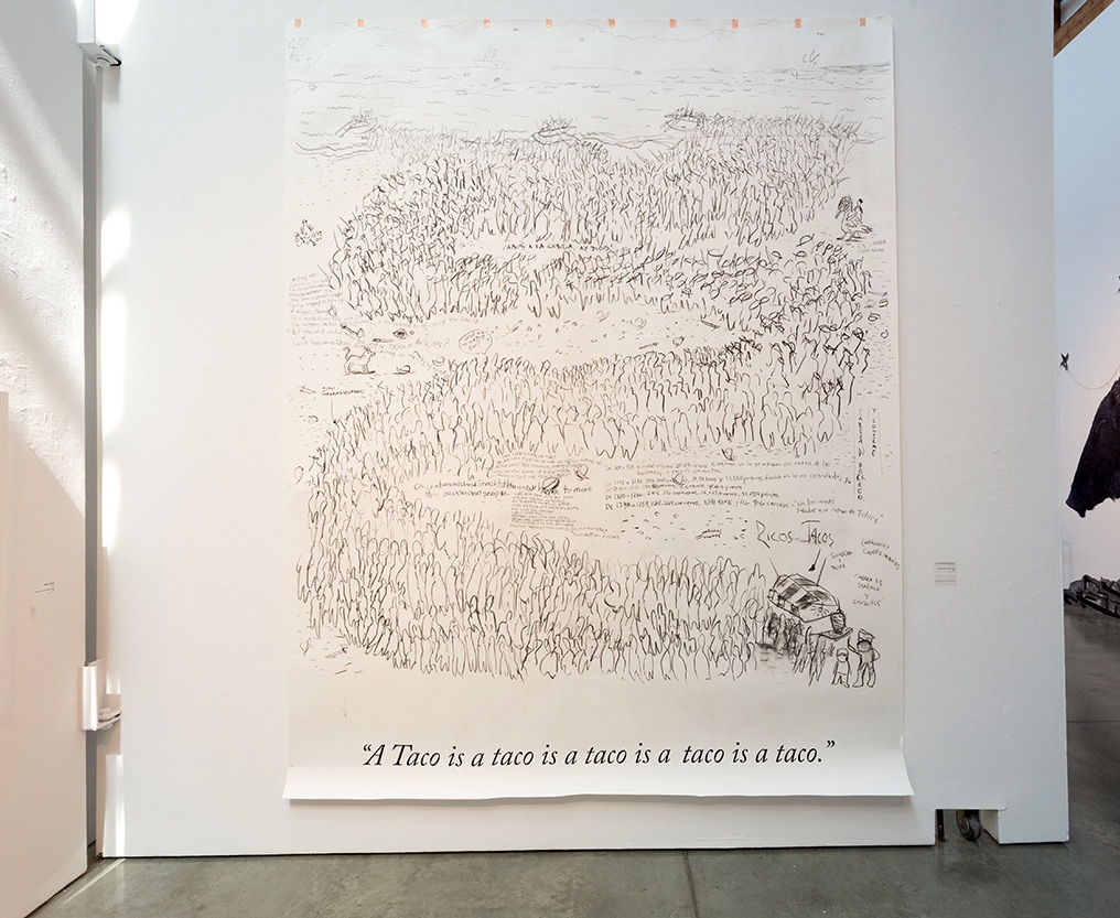 "Everyone enjoys a good taco. Flavours range from Pastor, Suadero, Bistec and the world famous Campechano. There are also a few vegetarian options like cactus or poblano peppers. After a night of drinking, taquerías will be swarming with hungry people looking for a good reason to sober up or hide the alcoholic scent under a perfume of cilantro and fresh onions. When Tenochtitlán was discovered, people where already eating tacos. Back then they where not known as tacos. Most likely, people recognized the meal as whatever was inside of the tortilla. The tortilla, a spoon that functioned as well as a plate was sometimes misrecognized by european settlers as a surface that held meat but was not edible. In some cases the meat was eaten and the tortilla was later discarded. Slowly but surely the taco has become a well known commodity. An object of pure desire. A symbol of identity and a welcoming and all encompassing cultural support. Hence the slogan: A Taco is a taco is a taco is a taco is a taco..."