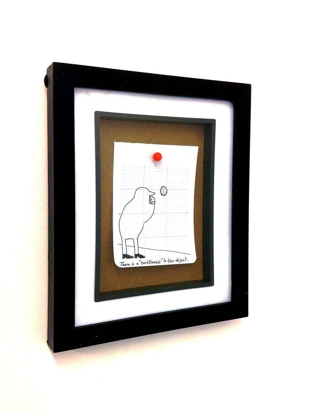ink on graph paper, repurposed frame bought at Value Village, 7 x 8.5 in, caption reads: "There is a tortillaness to this object"